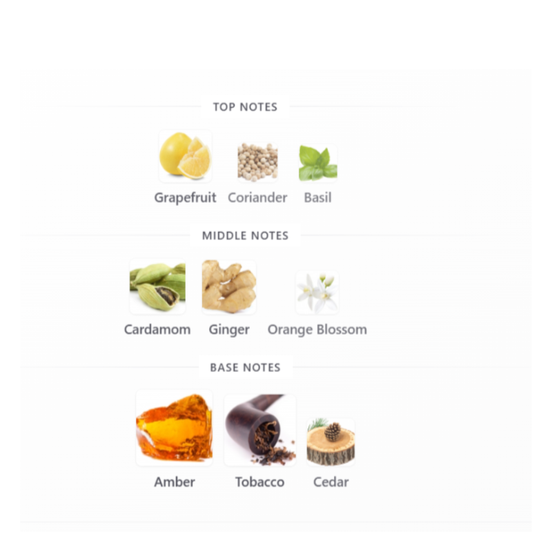 Base Notes: Amber, Tobacco, Cedarwood